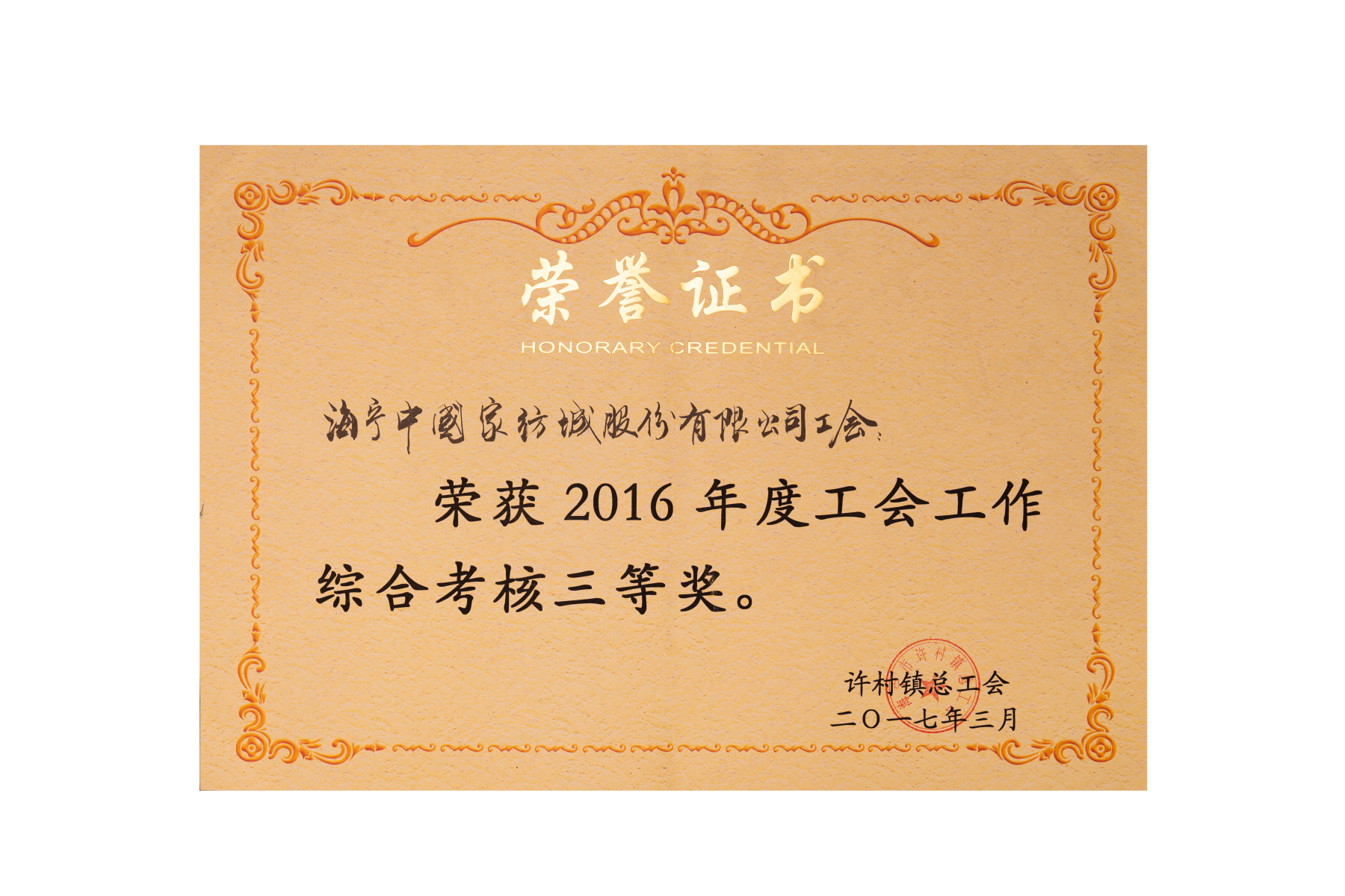 2016年度工会工作综合考核三等奖