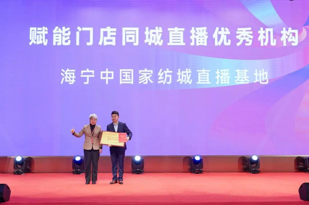 中国纺织工业企业管理协会副会长、中国纺织工业联合会产业集群工作委员会副主任兼秘书长张海燕为荣获“赋能门店同城直播优秀机构”的代表颁奖。