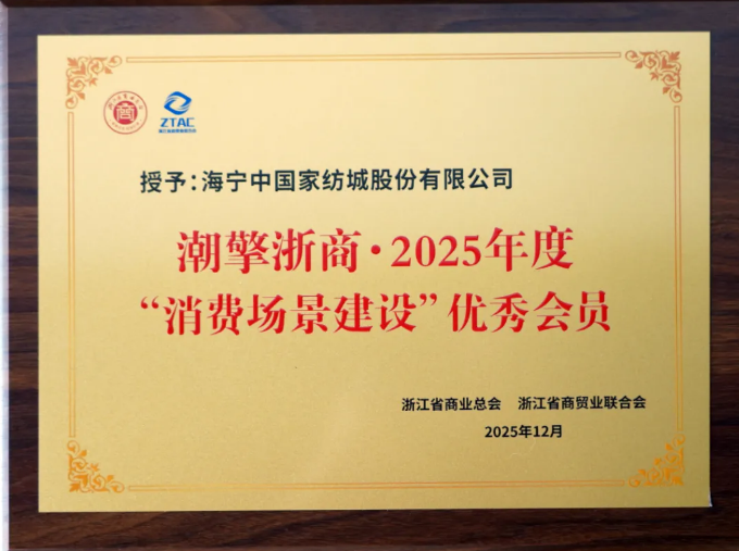 12月30日,由浙江省委社会工作部、浙江省商务厅、浙江工商大学、浙江交通集团指导,浙江省商贸业联合会、浙江省商业总会、浙江工商大学现代商贸研究中心联合主办的“潮擎浙商 向新提质”2025浙江商业高质量发展创新大会在杭州黄龙饭店隆重举行,会上集中表彰了浙江省商业总会、浙江省商贸业联合会“潮擎浙商·2025年度优秀会员”。海宁中国家纺城股份有限公司凭借在沉浸式体验、即时零售等消费场景建设上的创新实践,荣获“潮擎浙商·2025年度‘消费场景建设’优秀会员”称号。