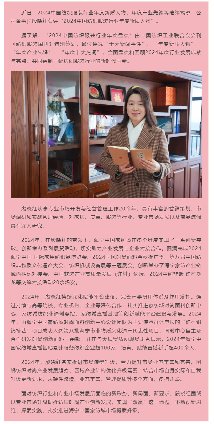 殷晓红董事长获评“2024中国纺织服装行业年度新质人物”