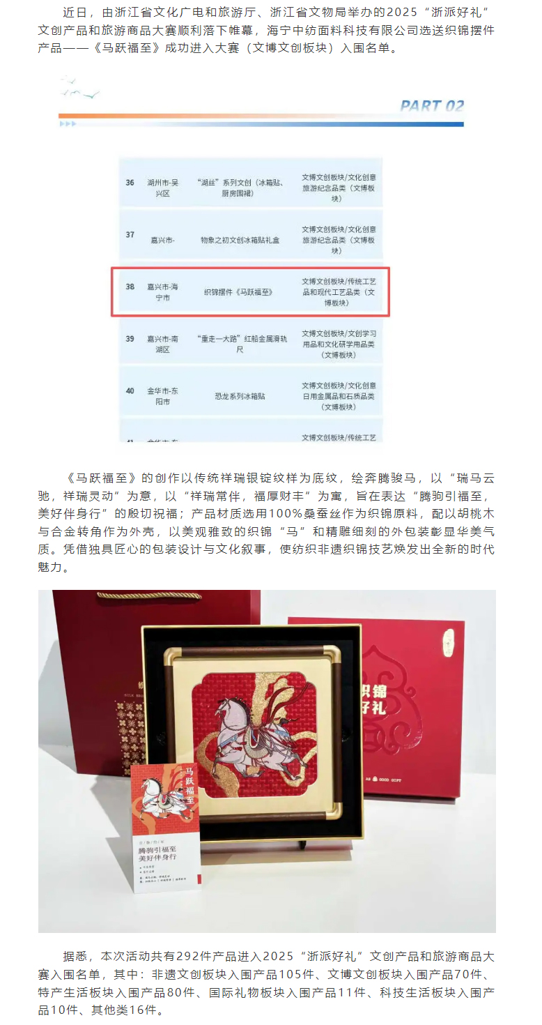 喜报丨海宁中纺面料科技有限公司文创产品《马跃福至》成功进入2025“浙派好礼”文创产品和旅游商品大赛入围名单