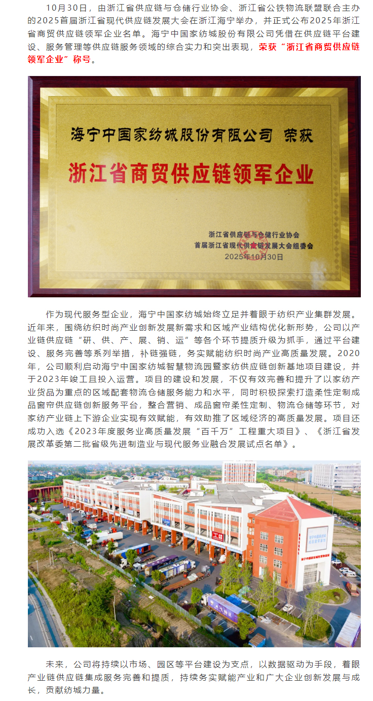 喜报丨海宁中国家纺城股份有限公司荣获浙江省商贸供应链领军企业