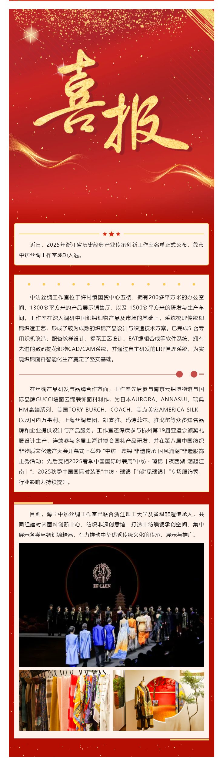 海宁中纺丝绸工作室成功入选浙江省历史经典产业传承创新工作室